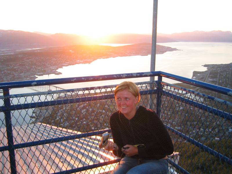 Lise, one of the fearless trip organizers, tries to get pictures of the midnight sun with everybody's cameras.