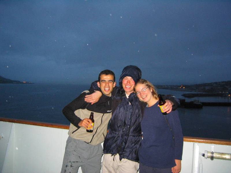 Jorge, Ronan, and Tjarda brave the rain to pose for a photo.