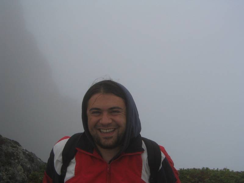 Tolga poses by a cliff. Unfortunately, all you can see is fog.