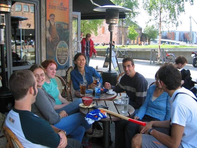 At the cafe with friends old and new. Wait... is that an axe on the table?